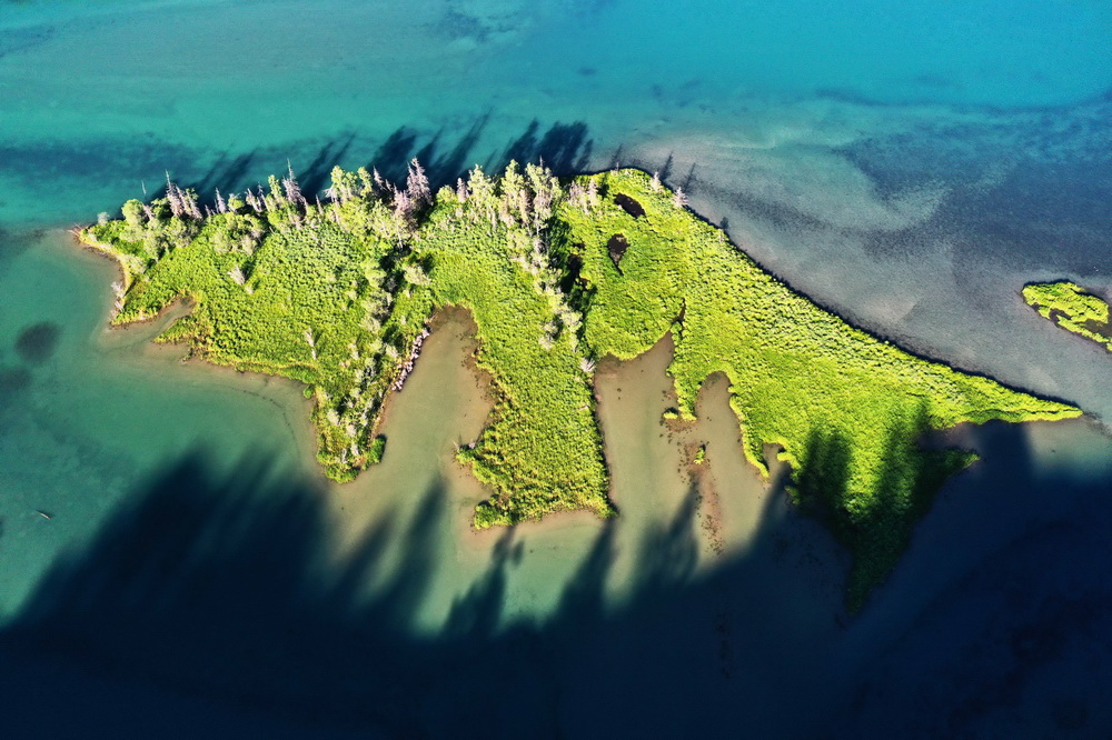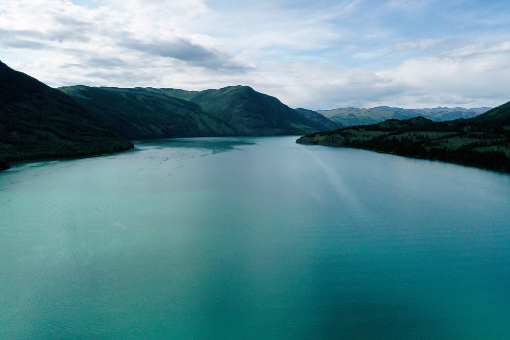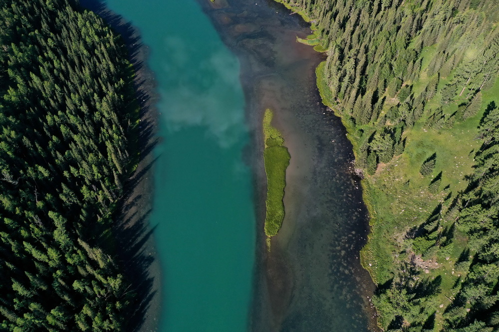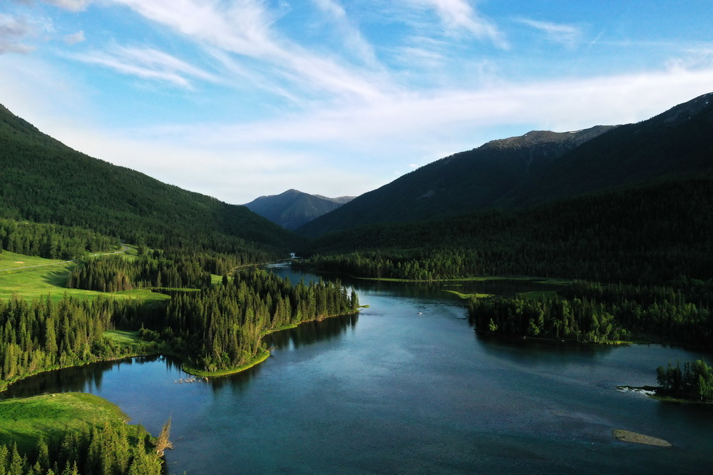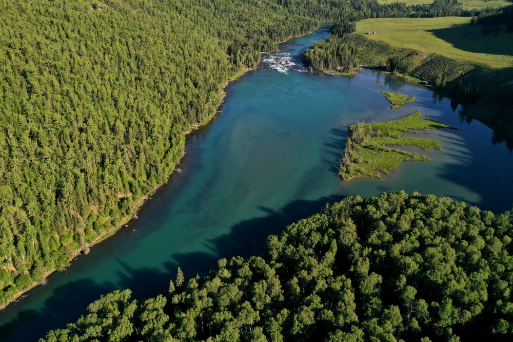 這是6月25日拍攝的新疆喀納斯景區(qū)風(fēng)光(無人機(jī)照片)。新華社記者 沙達(dá)提 攝