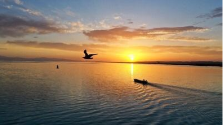 立秋過后,新疆博斯騰湖上漁民秋捕繁忙。位于新疆巴音郭楞蒙古自治州博湖縣境內(nèi)的博斯騰湖是我國(guó)最大的內(nèi)陸淡水湖,也是新疆最大的漁業(yè)生產(chǎn)基地。博斯騰湖年產(chǎn)草魚、鰱魚、鯉魚等32種魚類約4000噸。圖為8月8日,在新疆博斯騰湖,漁民駕駛漁船前往捕撈區(qū)域(無人機(jī)照片)。新華社發(fā) 年磊 攝