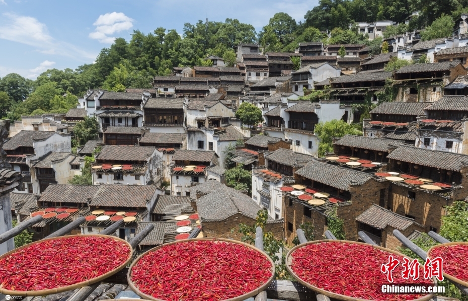 由于婺源的大多村莊是依山而建,平地較少,為將晾曬的食材安排的合理妥當(dāng),家家戶戶都展現(xiàn)了自家“空間管理”的高超技巧。圖為江西上饒婺源篁嶺古村,篁嶺獨具古韻的閣樓人家,處處可見絢爛的曬秋。稻谷、玉米、南瓜、豌豆、蘿卜曬在竹匾上,用橫木托著。