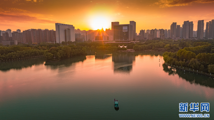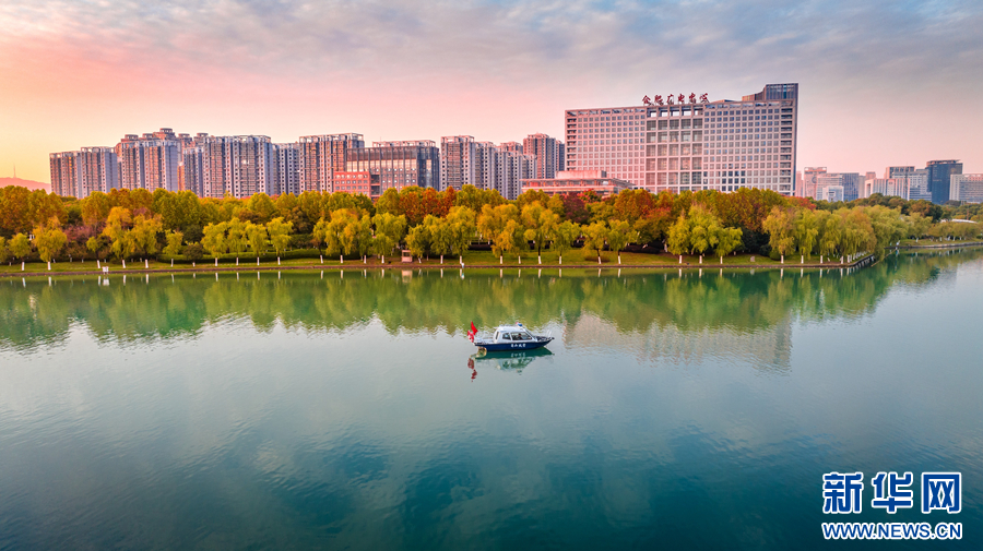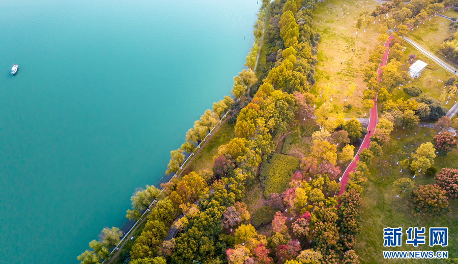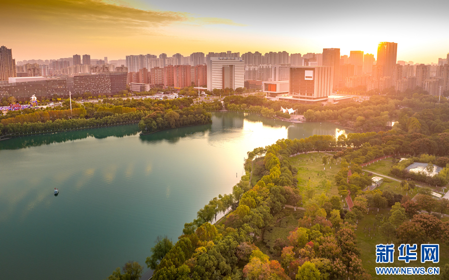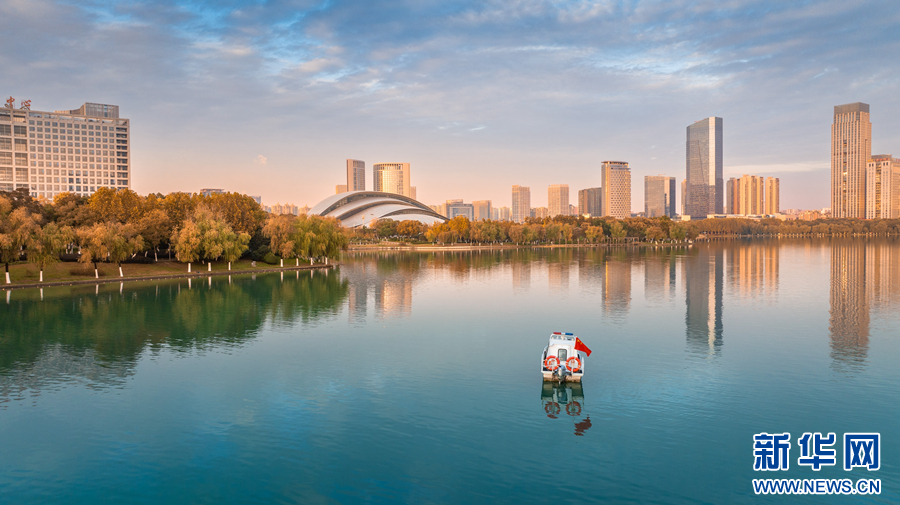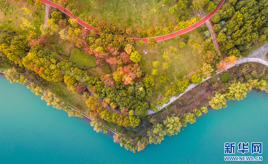 近日,在安徽省合肥市政務(wù)區(qū)天鵝湖畔,層林盡染,景色旖旎。周圍的樹(shù)木、建筑物,與清澈的湖水交相輝映,渲染成一幅色彩斑斕的迷人畫(huà)卷。新華網(wǎng)發(fā)(劉玉才 攝)