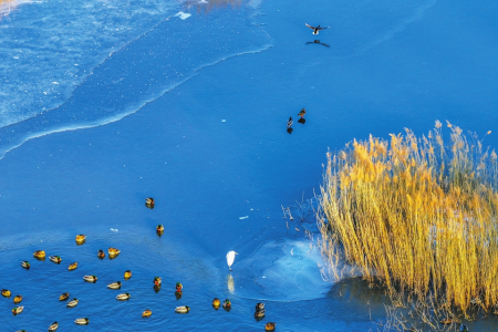 平遙縣汾河三壩濕地,一群綠頭鴨和白鷺在水中悠閑過冬。