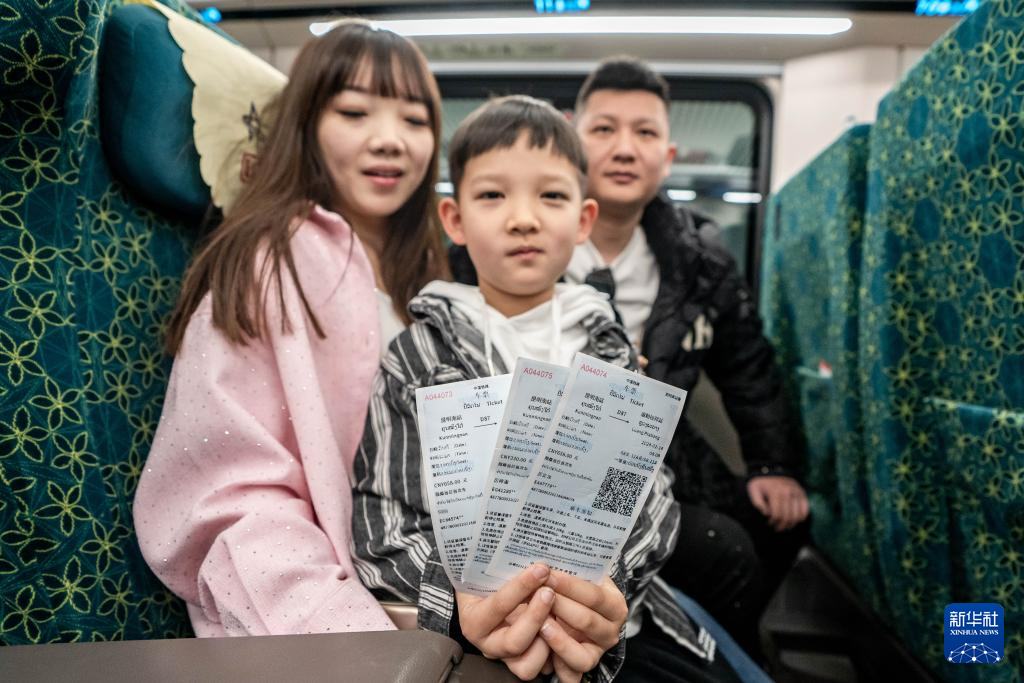 2月14日,在云南昆明,乘坐中老鐵路國際旅客列車前往老撾的游客展示購買到的車票。