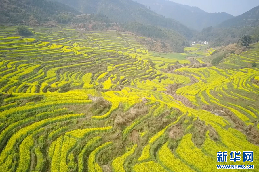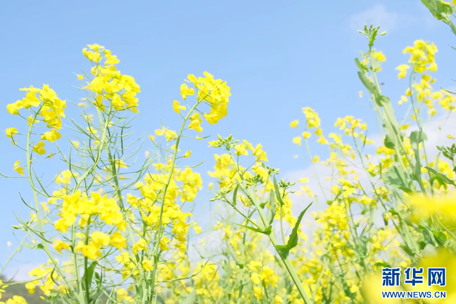 金黃的油菜花盛開如海,花田內(nèi)一片金黃璀璨。新華網(wǎng)發(fā)
