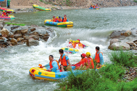 體驗完水上樂園后,張子良一行乘車來到位于中莊村的龐泉溝激情漂流。剛下車就看到了碼頭上熱鬧的景象,一艘艘漂流艇上坐滿了前來體驗的游客,大家穿著救生衣在工作人員的護(hù)送下向下漂流。偶爾遇到一處急流險灘,漂流艇隨著奔騰的水流飛馳而起,一眨眼的工夫就已落到了下一個平潭區(qū),游客們發(fā)出了陣陣尖叫。一路刺激,一路驚心,漂流給游客們留下了深刻的印象。負(fù)責(zé)該項目的閔玉貴介紹,項目選取了文峪河最精華的10公里河道,累計落差130米,平均水深0.8米,河道時寬時窄,水流時急時緩,沿途既有急流險灘,又有緩流碧潭,由于經(jīng)過了精心設(shè)計,且河道兩岸安排了上百名安全員護(hù)航,可以確保有驚無險。