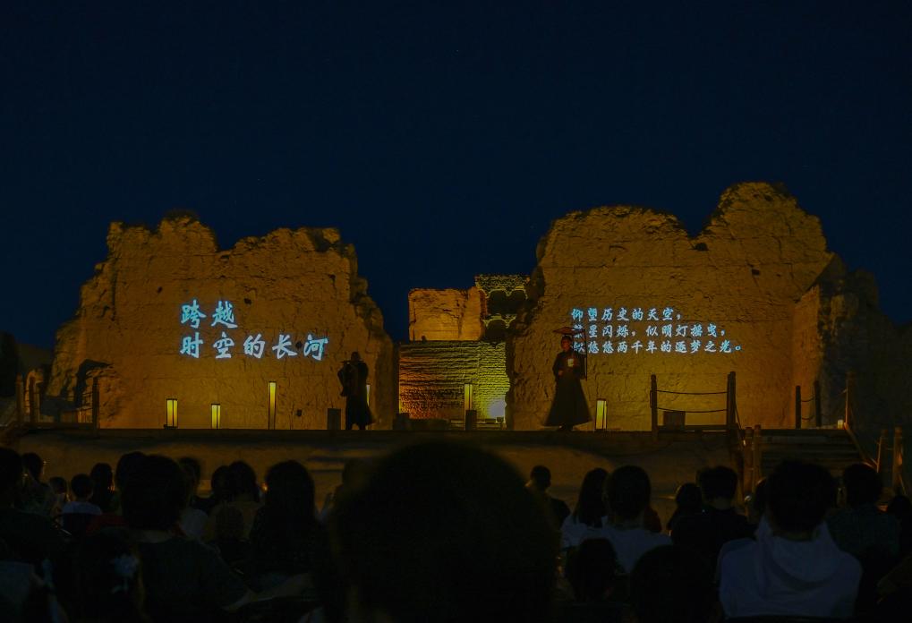 深藍(lán)色夜幕下,兩排戶外燈照亮高大殘舊的城墻。身著僧侶服飾的演員雙手合十、懷抱經(jīng)卷,從夜色中走來。時鐘隨著他的朗誦,仿佛回轉(zhuǎn)到佛教鼎盛期的唐代西域。在舞臺前方席地而坐的游客,看得如醉如癡。
