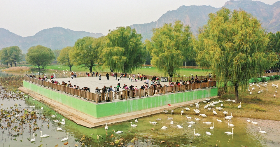 11月10日,運(yùn)城市平陸縣三灣黃河濕地,成群野生大天鵝在這里棲息越冬,吸引眾多游客前來(lái)觀賞,展現(xiàn)出一幅人與自然和諧相處的美麗生態(tài)畫卷。近年來(lái),平陸縣持續(xù)推進(jìn)黃河沿岸濕地生態(tài)治理與環(huán)境修復(fù),拉動(dòng)當(dāng)?shù)剞r(nóng)文旅產(chǎn)業(yè)深度融合,助推縣域經(jīng)濟(jì)高質(zhì)量發(fā)展。