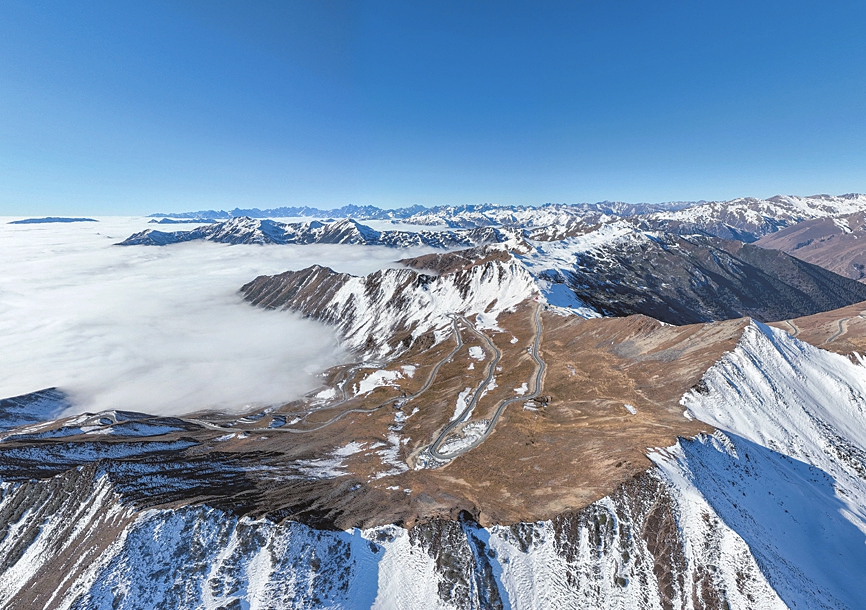圖為12月25日拍攝的四川夾金山云海(無(wú)人機(jī)照片)。冬日的四川夾金山,云海翻騰。從高空俯瞰,連綿起伏的群山被云?;\罩,呈現(xiàn)出壯美的自然風(fēng)光。
