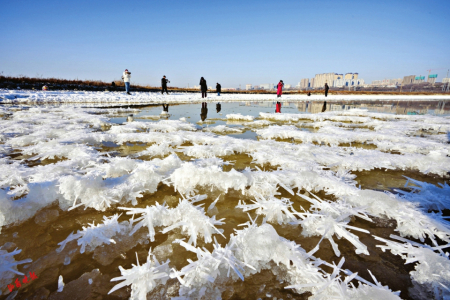 運(yùn)城鹽湖也別有一番風(fēng)味。隨著氣溫的降低,芒硝在湖面上結(jié)晶,綻放著潔白晶瑩的“硝花”,如同一片片精致的雪花在水中盛開,湖面如鏡,水天一色,遼闊而詩(shī)意。