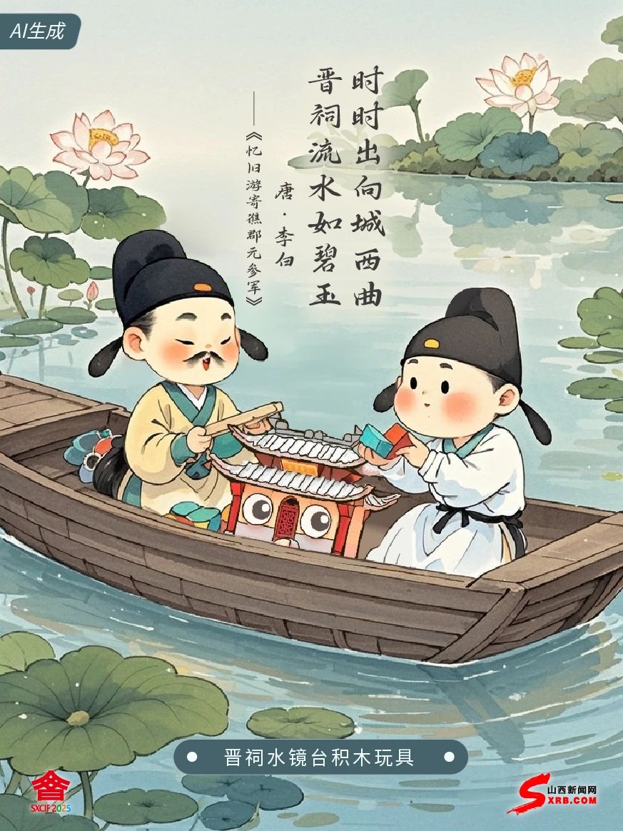 我是李白 我第一次到山西 是和我的朋友元演一起 我們在晉祠浮舟弄水恣意笙歌 直到日斜月升才歸 如今文博會以“水鏡臺”為原型 用彩色積木拼出重檐歇山頂 一榫一卯藏納乾坤 方寸之間我再次領(lǐng)略到晉祠之美