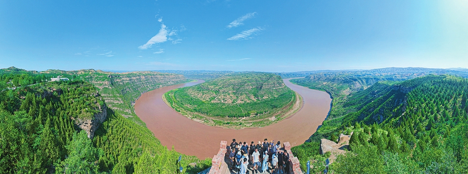 8月19日,游客在永和縣乾坤灣景區(qū)游覽觀光、合影留念。近年來(lái),該縣不斷提高當(dāng)?shù)厣指采w率,并依托紅色旅游資源發(fā)展文旅經(jīng)濟(jì),把東征村156孔窯洞改造成民宿旅館,增加了村集體和村民收入。