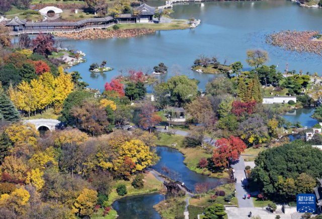 11月18日,游客在江蘇揚(yáng)州瘦西湖風(fēng)景區(qū)游覽(無人機(jī)照片)。新華社發(fā)(孟德龍攝)