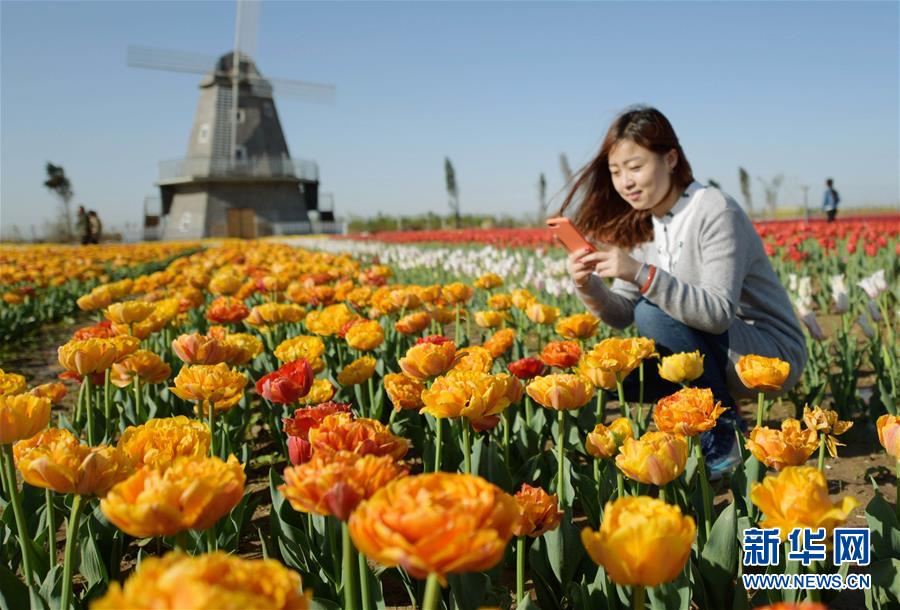 4月19日,游客在衡水湖森林公園欣賞郁金香。近日,河北衡水市冀州區(qū)衡水湖森林公園的48個(gè)品種、近百萬(wàn)株郁金香競(jìng)相開(kāi)放,吸引游客前來(lái)觀賞游玩。(新華社記者 王曉 攝)