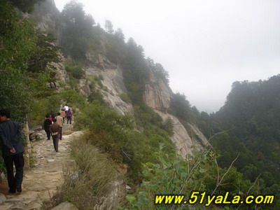 北武當(dāng)山主峰四周幾乎都是陡壁懸崖,只有一條人造“天梯”可攀。來(lái)到山腳下,過(guò)五里黃土、五里沙路,便是1400余級(jí)就山鑿筑的石階,凡險(xiǎn)峻之處,設(shè)有鐵索扶手。石階一線疊置,從下仰視,宛如“天梯”。游人攀登,每一步都可聽(tīng)到悠揚(yáng)頓挫的“石音”,形成獨(dú)特的“石樂(lè)”絕景。沿著石階,奇松異石、廟宇石刻,掩沒(méi)在蔥郁的山林植被之中,相間點(diǎn)綴,相映成趣。主要的山石景觀有:古猿望日、石豬受難、九龍出洞、石象守山、天壺傾露、石羊朝圣、石龜下蛋、石虎、石蛤蟆、龜蛇斗智等。最令人稱奇的是“龜蛇斗智”奇觀,相傳神龜和青蛇不安心修道,互相格斗,經(jīng)過(guò)七七四十九天的麈戰(zhàn),神龜節(jié)節(jié)敗退,青蛇步步緊逼。其時(shí),恰逢真武大帝返宮,見(jiàn)狀,輕輕用手指一點(diǎn),龜蛇便動(dòng)彈不得,從此永久停留在這里,成千古一絕——“蛇石”虎視眈眈,“龜石”尾臨懸崖,萬(wàn)斤重石,峭立崖畔,用力一推或經(jīng)風(fēng)一吹,便搖搖欲墜,令人心懸,所以又稱風(fēng)動(dòng)石,為我國(guó)罕見(jiàn)的景觀之一。主要的奇松景觀有:鴛鴦松、迎客松、托天松、母子松等。最使人嘆為觀止的是“擎天探海松”,其松立于石階半道,樹(shù)身技分兩杈,一直刺青天,一枝瞰群峰。近金頂?shù)悄咸扉T(mén)石階,旁邊陡崖上刻有“喬松”二字,據(jù)載為清代道光年間永寧州牧王繼賢手跡?,F(xiàn)存喬松樹(shù)樁直徑近1米,可以想見(jiàn)其昔日雄姿。主要的懸崖峭壁有:千仞壁、舍身崖、鷹嘴崖等。還有呈垂直分布的植被,其色彩和花期隨季節(jié)變化,給北武當(dāng)山披上了“春粉、夏艷、秋紅、冬白”的盛裝。登臨武當(dāng)之巔,一覽眾山,但見(jiàn)遠(yuǎn)山蒼茫,近日含黛,松風(fēng)撲面,白云飄逸;只聞松濤陣陣,山泉潺潺,鳥(niǎo)語(yǔ)唧唧,似琴弦輕撥;夏秋之季,如晴空萬(wàn)里,金頂之下,叢林景觀相間,似七彩織錦;白云遠(yuǎn)處,群山連綿,猶如萬(wàn)龍翻騰,極為壯觀。