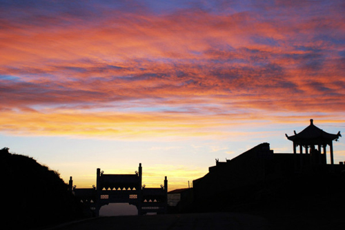 望海峰的盛景在于東觀日出。由于東面再無(wú)大山阻擋,所以人的目力可東眺非常遙遠(yuǎn)的地方。峰頂曾建有望海樓,專門為觀景而建??上昃靡褮В?985年重建,為望海寺,內(nèi)供聰明文殊。有史籍記載日出之壯麗景象:“每當(dāng)蒸云寢壑之隙,爽氣澄秋之際,于日出扶桑之時(shí),可望紅日十倍于車輪,紅輪之下,隱隱水光閃爍,若波若鏡,瑰麗非凡。1977年8月,趙樸初先生登東臺(tái)觀日出后乘興填詞《五臺(tái)雜詠·調(diào)寄憶江南》,形象描繪了東臺(tái)日出之勝景: