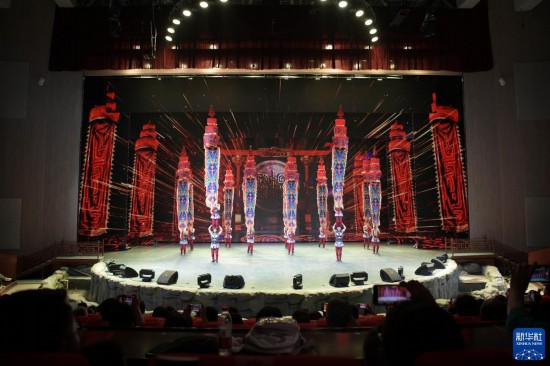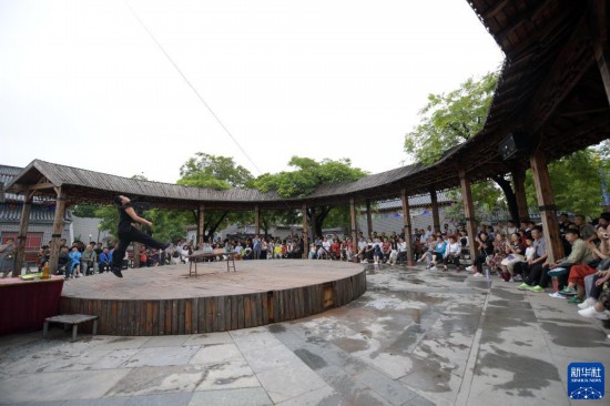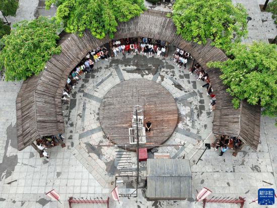 8月12日,在河北省滄州市吳橋雜技大世界景區(qū)江湖文化城,游客們觀(guān)看雜技藝人表演傳統(tǒng)雜技節(jié)目(無(wú)人機(jī)照片)。