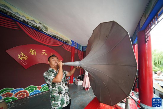 8月12日,在河北省滄州市吳橋雜技大世界景區(qū)江湖文化城吹破天劇場(chǎng),雜技藝人表演吹嗩吶。