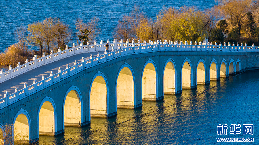 近日,天氣晴好,安徽省淮北市南湖濕地公園的十七孔橋在夕陽的照射下,呈現(xiàn)“金光穿洞”景象,美不勝收。新華網(wǎng)發(fā)(王文 攝)