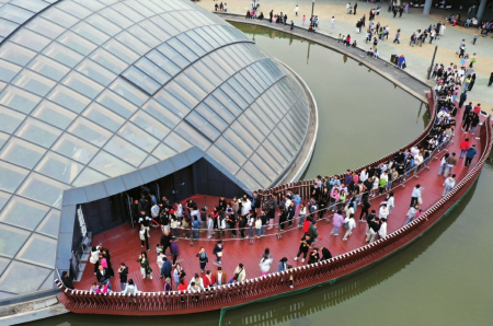 太原市植物園網(wǎng)紅電梯頂臺,游客登高望遠(yuǎn)。