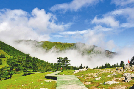 云頂山山勢險峻、風光秀麗,因山頂與云天相接而得名。這里有自然形成的彌佛山、城墻巖、虎頭石、通天龜、八戒看山、悟空出世等美景,林中有褐馬雞、金錢豹、黑鸛、金雕等國家一級保護動物,生長著黨參、秦艽、銀花、冬花、白芍、遠志、柴胡等多種野生中藥材。