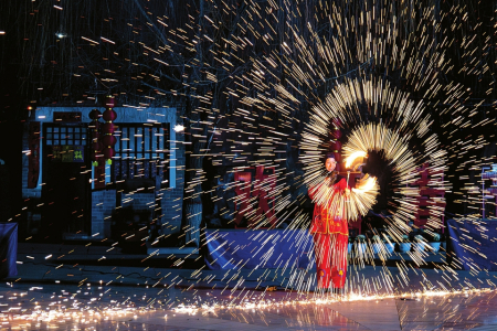 大槐樹景區(qū)在春節(jié)夜間游覽期間還邀請了網(wǎng)絡(luò)大火的“火”系非遺表演——“飛天鳳舞·鐵花魂”活動,其中囊括噴火、打火花、火壺等,為游客們奉上一場絢爛奪目的非遺盛宴。