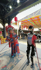 “山河+”人形機(jī)器人記者還與祁縣非遺傳承人上演了一場(chǎng)祁太秧歌,為游客助興。