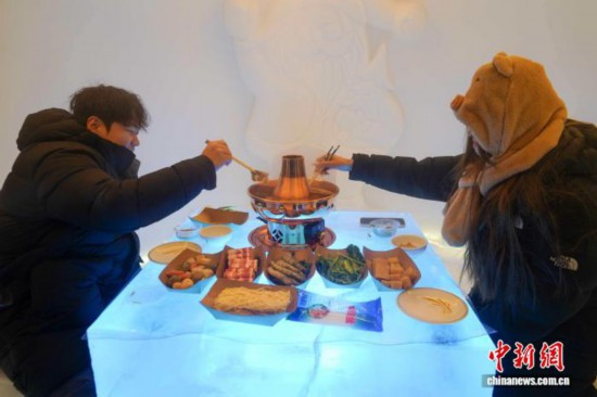 冰堡體驗(yàn)休息室布置了冰床、冰沙發(fā)等冰制陳設(shè),讓游客沉浸式體驗(yàn)冰雪住宿的新奇樂趣。 趙宇航 攝 在用雪打造的屋子里,羊肉片、凍豆腐、青菜拼盤等食材已經(jīng)擺好,陸續(xù)有游客前來體驗(yàn)雪屋火鍋的“冷熱交替”。“外面零下二三十度,吃著沸騰的火鍋很刺激?!北本┯慰蛣⒉┛≌f。