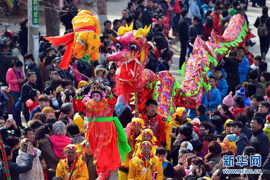 2月21日,社火隊(duì)在進(jìn)行巡游拜年。當(dāng)日,有著千年歷史的傳統(tǒng)村落——山東省章丘市三德范村組織31個(gè)社火隊(duì)舉行社火巡游拜年活動(dòng),在元宵佳節(jié)來臨之際為鄉(xiāng)親們送祝福。新華社記者 郭緒雷攝