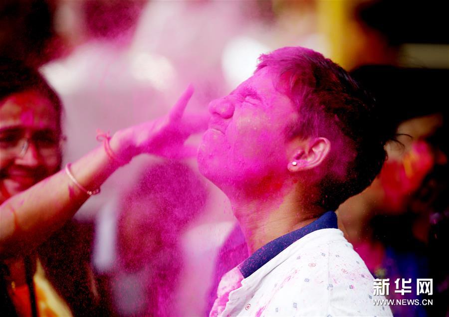 胡里節(jié)也叫“灑紅節(jié)”,人們?cè)谧约耗樕虾蜕砩贤可项伭希€向別人拋撒五顏六色的顏料和粉末,迎接春天的到來。新華社發(fā)(吳昂 攝)
