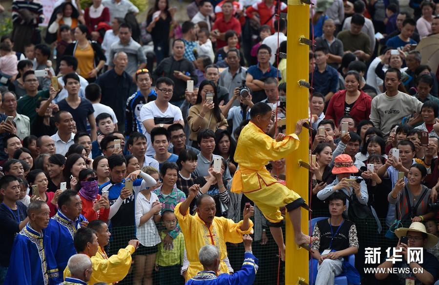 農(nóng)歷十月十五前后,福建西部武平縣各山村陸續(xù)進入農(nóng)閑時節(jié)。按照當(dāng)?shù)仫L(fēng)俗,不同村子各自擇日舉辦民間活動,其中較有代表性的就是“上刀山”絕技?!吧系渡健苯^技在閩西山村流傳已有數(shù)百年歷史,表演者需光腳順著磨得鋒利閃亮的36把鋼刀,攀登至8米高的杉木柱子頂部,接受長者祝福,祈求風(fēng)調(diào)雨順、五谷豐登。新華社記者 宋為偉 攝