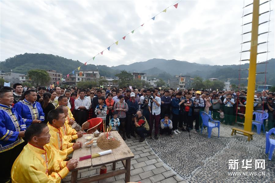 農(nóng)歷十月十五前后,福建西部武平縣各山村陸續(xù)進(jìn)入農(nóng)閑時節(jié)。按照當(dāng)?shù)仫L(fēng)俗,不同村子各自擇日舉辦民間活動,其中較有代表性的就是“上刀山”絕技。“上刀山”絕技在閩西山村流傳已有數(shù)百年歷史,表演者需光腳順著磨得鋒利閃亮的36把鋼刀,攀登至8米高的杉木柱子頂部,接受長者祝福,祈求風(fēng)調(diào)雨順、五谷豐登。新華社記者 宋為偉 攝