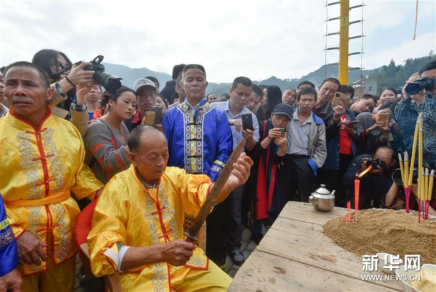 農(nóng)歷十月十五前后,福建西部武平縣各山村陸續(xù)進入農(nóng)閑時節(jié)。按照當?shù)仫L俗,不同村子各自擇日舉辦民間活動,其中較有代表性的就是“上刀山”絕技?!吧系渡健苯^技在閩西山村流傳已有數(shù)百年歷史,表演者需光腳順著磨得鋒利閃亮的36把鋼刀,攀登至8米高的杉木柱子頂部,接受長者祝福,祈求風調(diào)雨順、五谷豐登。新華社記者 宋為偉 攝