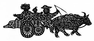 《姥爺送外甥》是靜樂民間老剪紙藝術(shù)家辛芙英早年的一幅剪紙,也是靜樂剪紙最具代表性的一幅名作,現(xiàn)收藏于中國美術(shù)館。這幅剪紙表現(xiàn)了閨女住完娘家之后,由父親(外甥的姥爺)趕著牛車送閨女和外甥回家的場面。剪紙人物造型生動形象,樂趣橫生,令人百看不厭。