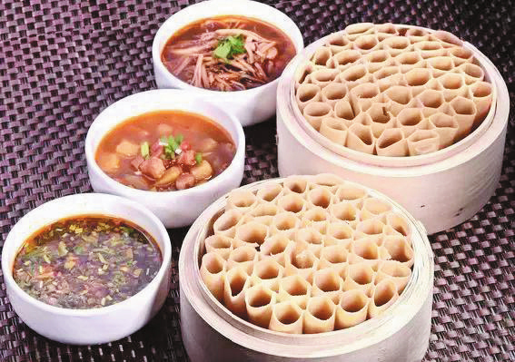 莜面栲栳栳。莜面栲栳栳又叫“莜面窩窩”,是過(guò)去老百姓農(nóng)忙時(shí)節(jié)為省事普遍愛(ài)做的一種飯食。它工藝講究,成形美觀(guān),口感筋道,再加上“羊肉臊子臺(tái)蘑湯”,真可謂“一家吃著十家香”,難怪就連康熙皇帝朝拜五臺(tái)山時(shí),也以品此為人生快事。其做法是:和面時(shí)加以燒開(kāi)的水,用筷子攪拌成面絮,趁熱將其揉成光滑的面團(tuán);取一小塊放在光滑的面板上,用手掌使巧勁一搓,然后撕起來(lái)往食指上繞,卷成中間空的小卷,豎在蒸籠里;最后放在沸水鍋上蒸10分鐘即熟,蒸時(shí)要注意火候,火候不到會(huì)不熟,蒸得過(guò)火則軟癱立不起來(lái),吃時(shí)味欠色減。