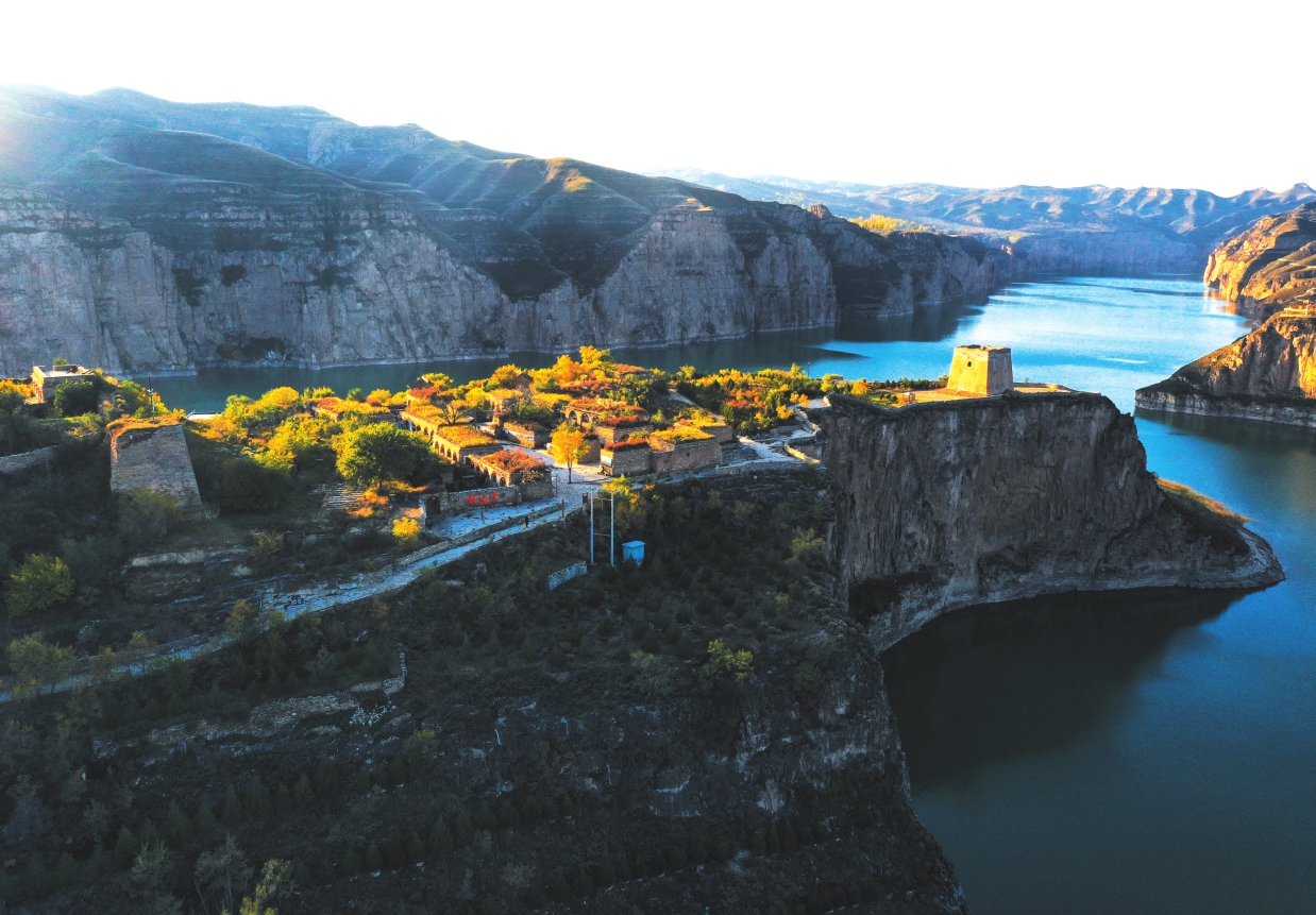 2015年的夏天,我又一次來到老牛灣,105米高的萬家寨水電大壩飛跨晉蒙,黃河水在絕壁中安靜了、變綠了。老牛灣村前的小河倒灌進了黃河水,一個灣成了兩個灣,團團地圍住了山村,又好似老牛彎出了兩個碧綠的牛角,太漂亮了。老鄉(xiāng)們說:“有企業(yè)來開發(fā)道路、景區(qū)了,也有北京游客開車來游玩了,拍照的多,照幾張相就走了?!蓖侨匀粴埰频拈T樓和石板院房,我不知該說什么、能說什么。