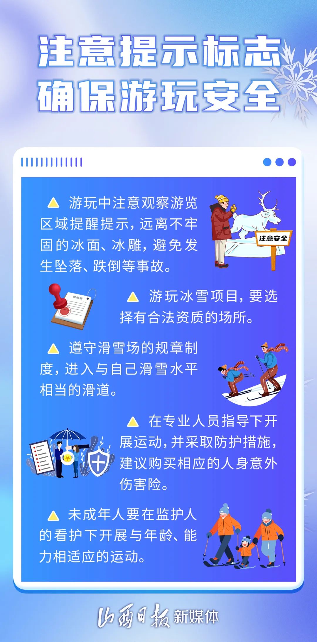雪花裝點(diǎn)了世界,同時(shí),也為出行帶來了安全隱患。下面是雪天安全出游的小常識(shí),請(qǐng)仔細(xì)閱讀。