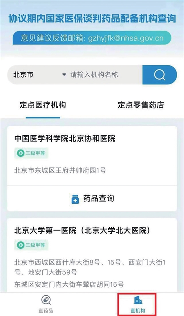 第三步:點(diǎn)擊“定點(diǎn)醫(yī)療機(jī)構(gòu)”或“定點(diǎn)零售藥店”,即可查詢該藥品在各地區(qū)的配備情況。同時(shí),您也可以點(diǎn)擊頁面下方“查機(jī)構(gòu)”,進(jìn)入“定點(diǎn)醫(yī)療機(jī)構(gòu)”或“定點(diǎn)零售藥店”頁面,確定具體的醫(yī)療機(jī)構(gòu)或零售藥店后,點(diǎn)擊“藥品查詢”,了解該機(jī)構(gòu)配備的全部“國談藥”情況。