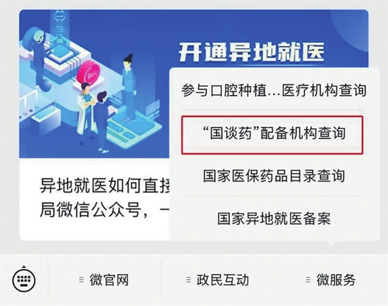 第一步:進(jìn)入“國家醫(yī)保局”微信公眾號,點(diǎn)擊微服務(wù)→“國談藥”配備機(jī)構(gòu)查詢,進(jìn)入查詢頁面。