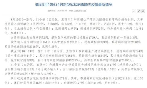 情況顯示,截至8月10日24時,據(jù)31個?。ㄗ灾螀^(qū)、直轄市)和新疆生產(chǎn)建設(shè)兵團(tuán)報告,現(xiàn)有確診病例794例(其中重癥病例44例),累計治愈出院病例79284例,累計死亡病例4634例,累計報告確診病例84712例,現(xiàn)有疑似病例3例。累計追蹤到密切接觸者802273人,尚在醫(yī)學(xué)觀察的密切接觸者23790人。