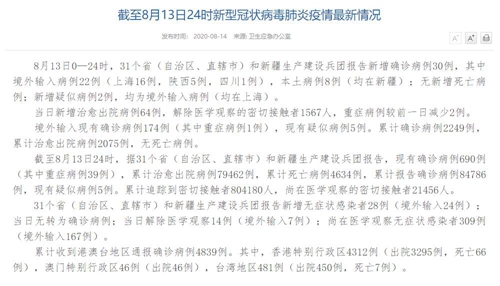 情況顯示,截至8月13日24時,據(jù)31個?。ㄗ灾螀^(qū)、直轄市)和新疆生產(chǎn)建設(shè)兵團報告,現(xiàn)有確診病例690例(其中重癥病例39例),累計治愈出院病例79462例,累計死亡病例4634例,累計報告確診病例84786例,現(xiàn)有疑似病例5例。累計追蹤到密切接觸者804180人,尚在醫(yī)學(xué)觀察的密切接觸者21456人。