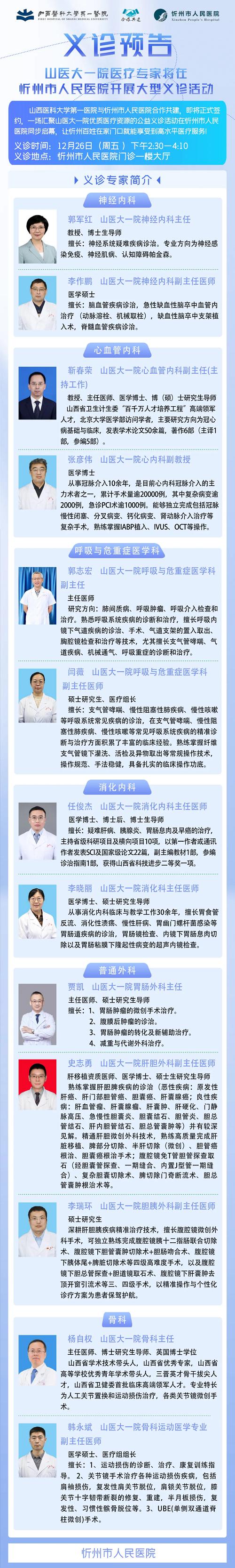 【義診預(yù)告】12月26日,山西醫(yī)科大學(xué)第一醫(yī)院醫(yī)療專(zhuān)家將在忻州市人民醫(yī)院開(kāi)展義診活動(dòng)