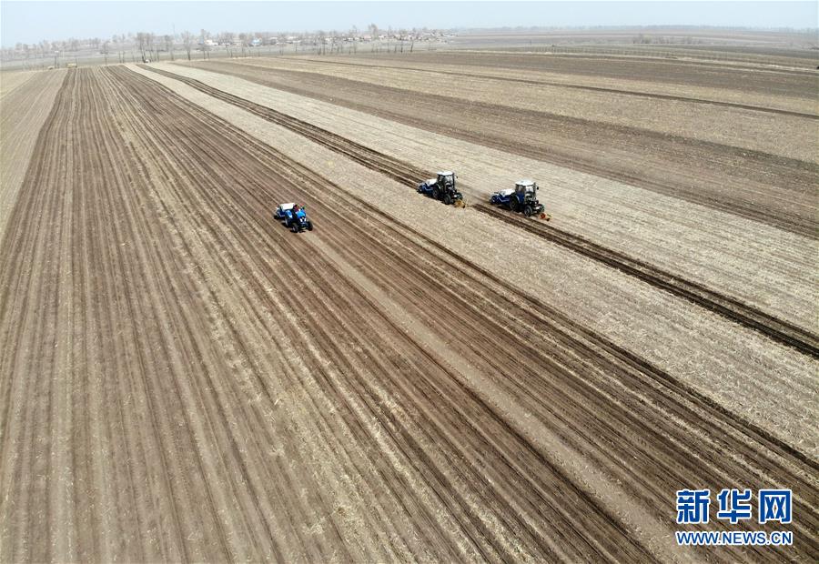 4月23日無人機拍攝的吉林省榆樹市弓棚鎮(zhèn)農(nóng)民在進行春耕生產(chǎn)。新華社記者 林宏 攝
