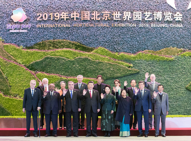 4月28日,國(guó)家主席習(xí)近平在北京延慶出席2019年中國(guó)北京世界園藝博覽會(huì)開(kāi)幕式,并發(fā)表題為《共謀綠色生活,共建美麗家園》的重要講話(huà)。這是開(kāi)幕式前,習(xí)近平和夫人彭麗媛同參加開(kāi)幕式的外方領(lǐng)導(dǎo)人集體合影。新華社記者 黃敬文 攝