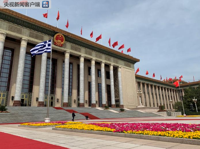 △希臘國(guó)旗在人民大會(huì)堂東門外廣場(chǎng)升起,歡迎希臘總統(tǒng)的儀式即將開(kāi)始。(央視記者段德文拍攝)