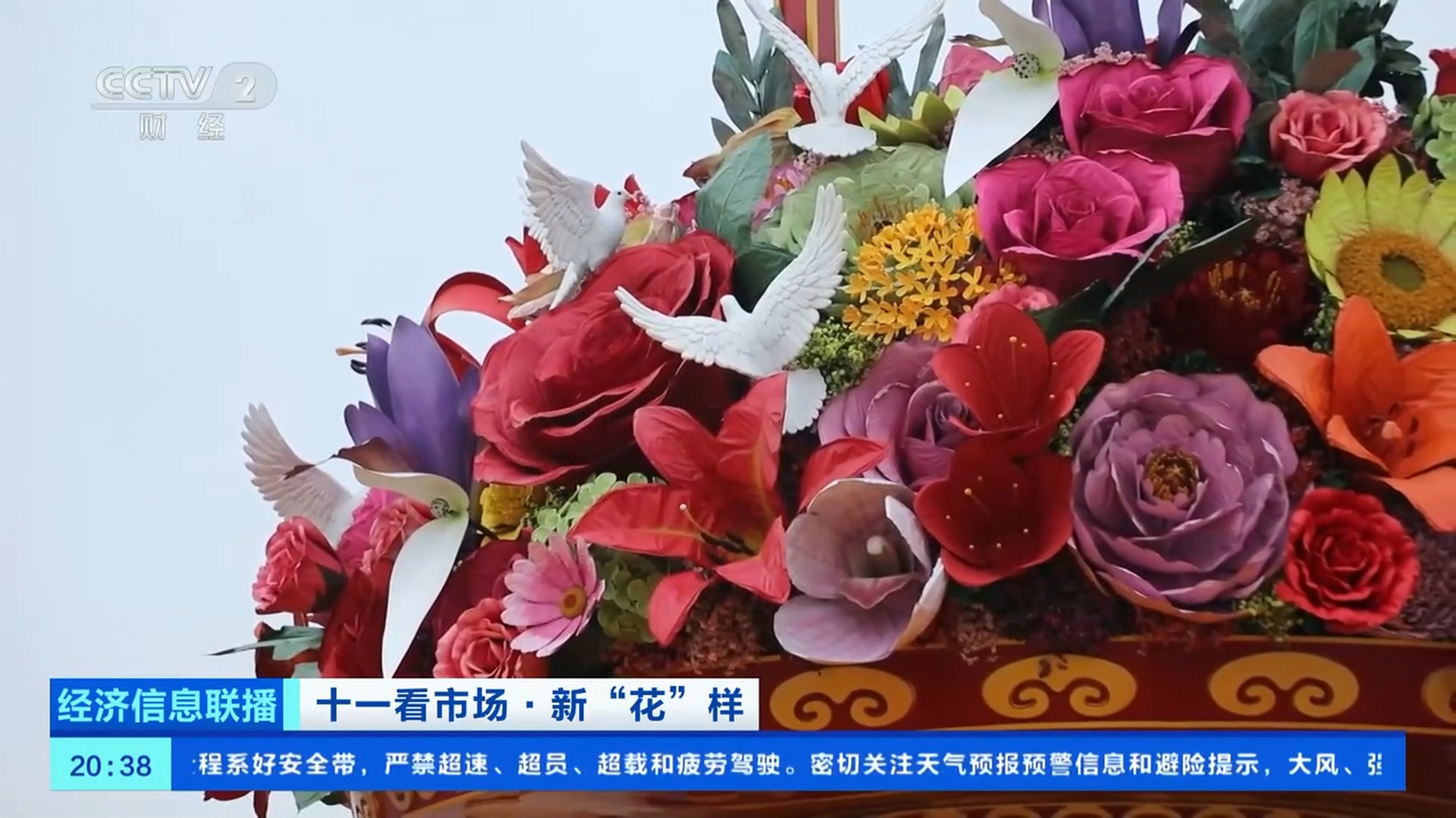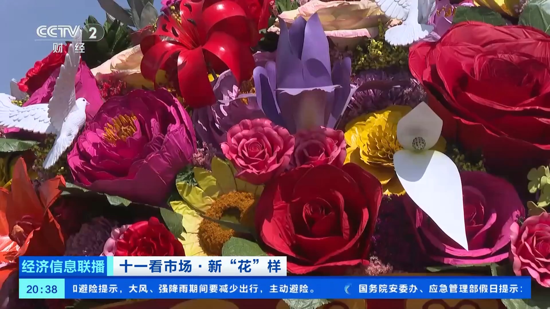 天安門花壇總工程師 張先哲:在天安門廣場我們要抗12級風,這些大型的花朵要在大風中巋然不動,依然要保持它良好的面貌,所以我們用的大型仿真花比較多。今年,這些花朵的大小和色彩做得更加精致自如,比如鳶尾花花瓣用了彩繪,讓它的細節(jié)、紋理、顏色更加逼真。大花籃里的山丹丹、鴿子花,用的雕塑工藝,是用一些不銹鋼板敲制出來的。