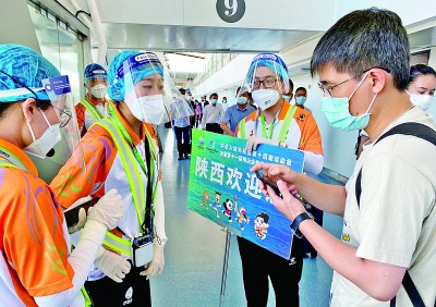 9月14日,在西安咸陽機場,工作人員為參加全運會的記者提供服務。本報記者 郭紅松攝/光明圖片