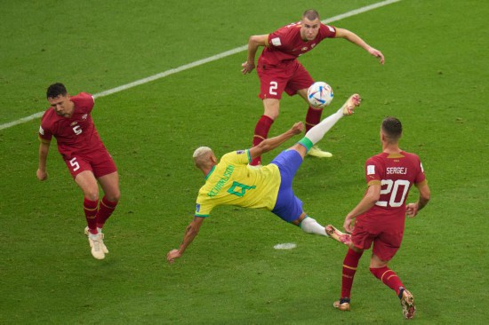 在首輪最后一場較量中,G組的巴西隊與塞爾維亞隊在上半場沒能進球。易邊再戰(zhàn),巴西隊的理查利森接管了比賽,他先是在第62分鐘補射入網(wǎng),又在第73分鐘憑借個人能力完成一記精彩的轉(zhuǎn)身倒鉤破門,為球隊鎖定勝局。