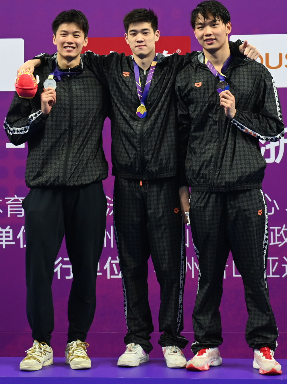 5月4日,分獲男子200米自由泳前三名的浙江隊(duì)選手潘展樂(lè)(中)、汪順(左)和洪金權(quán)在頒獎(jiǎng)儀式上合影。新華社記者黃宗治攝