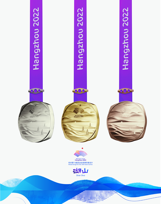 獎(jiǎng)牌取名為“湖山”,它的設(shè)計(jì)靈感源自五千年良渚文明,展示中國(guó)江南文化,呈現(xiàn)杭州山水景觀。在亞運(yùn)會(huì)獎(jiǎng)牌設(shè)計(jì)中首次將方形玉琮和圓形獎(jiǎng)?wù)氯跒橐惑w,其中獎(jiǎng)牌正面用凸出的線條勾勒出“三面云山一面城”的杭城畫(huà)卷,湖水漣漪,山巒起伏;獎(jiǎng)牌背面,形似方形印章,寓意運(yùn)動(dòng)員們?cè)诤贾輥嗊\(yùn)會(huì)上留下美好的印記。