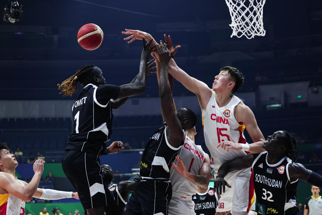 8月28日,中國隊球員周琦(右二)在比賽中拼搶。當日,在菲律賓馬尼拉舉行的2023年籃球世界杯B組小組賽中,中國隊以69:89不敵南蘇丹隊。新華社記者 吳壯 攝