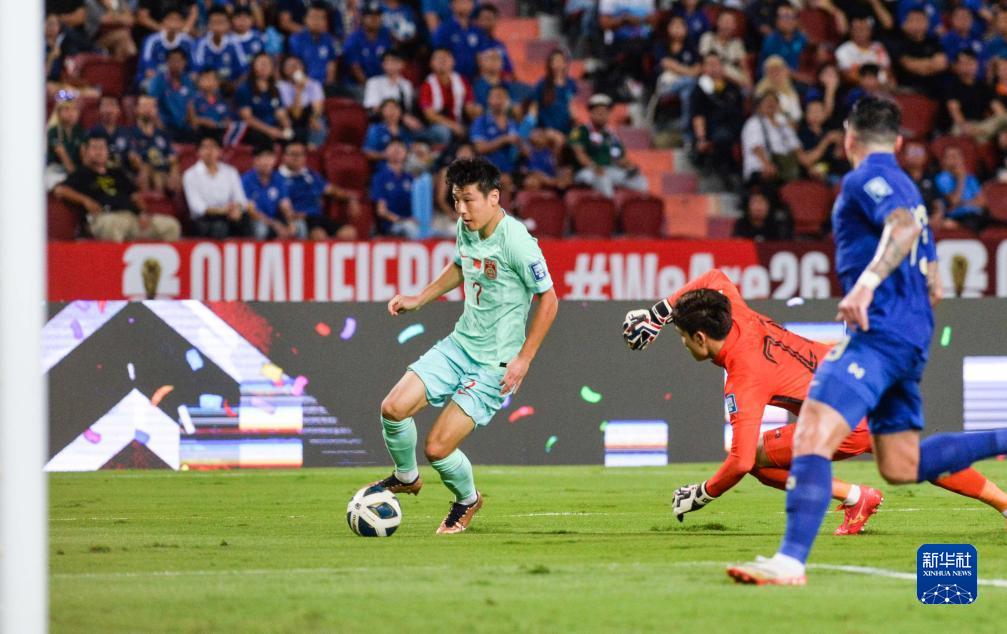 11月16日,中國隊(duì)球員武磊(左)在比賽中進(jìn)攻。當(dāng)日,在泰國曼谷舉行的2026世界杯預(yù)選賽亞洲區(qū)36強(qiáng)賽C組比賽中,中國隊(duì)以2比1戰(zhàn)勝泰國隊(duì)。新華社發(fā)(拉亨攝)
